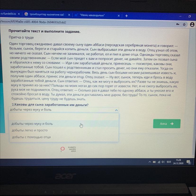 Скорее всего первый "добытые через муку и боль" потому что остальные варианты не соответствуют сюжету притчи.)