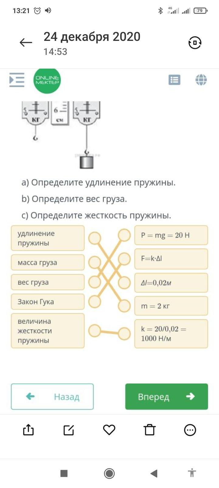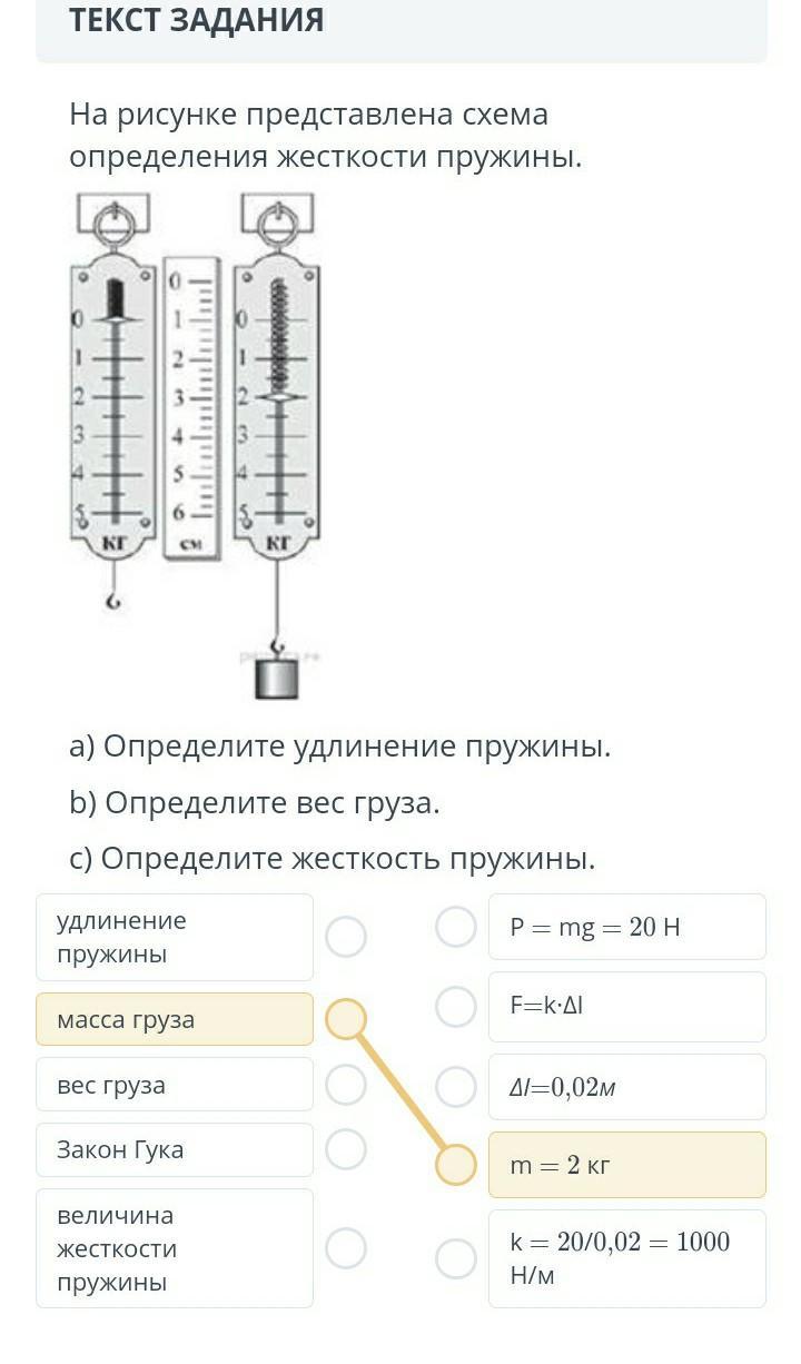 На рисунке представлена схема определения жесткости пружины. 3 KT RT а) Определите удлинение пружины. Б) Определите вес груза. с) Определите жесткость пружины. удлинение пружины масса груза вес груза Закон Гука величина жесткости пружины P = mg = 20H F = k*Delta * l Delta*l = 0, 02M m = 2kr k = 20/0, 02 = 1000 H / M Назад Вперед II