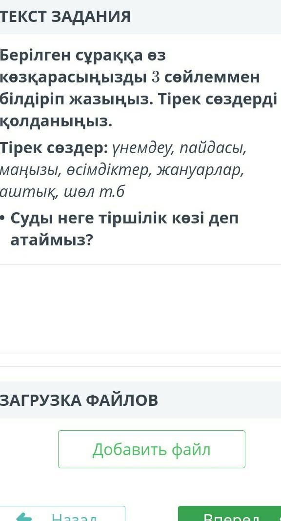 Су — тіршілік көзі, табиғатта ең көп таралған зат. Су Жер шарының 3 / 4 бөлігін алады. Тіршілік құбылыстарының бәрі судың қатысуымен жүреді, табиғаттағы барлық тіршілік атаулының құрамына кіреді.Тірі ағзалардың 60-70 %-ы , ал өсімдіктердің 90 % -ы судан тұрады.