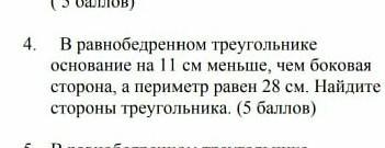 В равнобедренном треугольнике основание 11 см меньше, чем баковая сторона, а периметр равен 28 см. Найдите стороны треугольника.