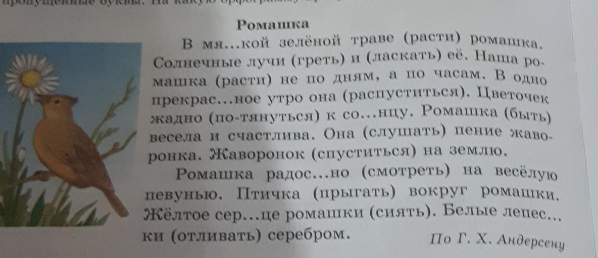 В мягкой, зелёной траве росла ромашка.Солнечные лучи грели и ласкали её. Наша ромашка росла не по дням, а по часам. В одно прекрасное утро она распустилась. Цветочек жадно потянулась к солнцу. Ромашка, была весела и счастлива. Она слушала пение жаворонка. Жаворонок, спустилась на землю.