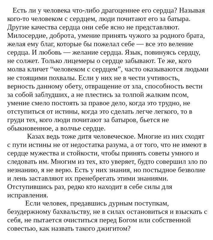 Если у них не в чести учтивость, верность данному обету, отвращение от зла, способность вести за собой заблудших, а не плестись за толпой жалким псом, умение смело постоять за правое дело, когда это трудно, не отступиться от истины, когда это сделать легче легкого, то в груди тех, кого люди почитают за батыров, бьется не обыкновенное, а волчье сердце.