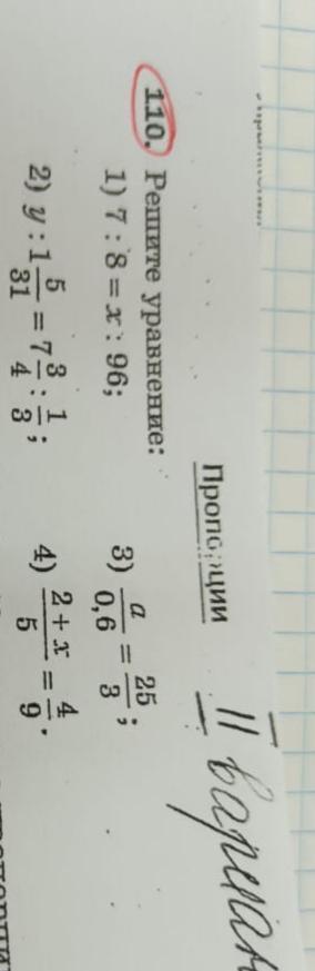 7 \div 8 = x \div 96 \\ 672 = 8x \\ 8x = 672 \\ x = 84 \\  \\ y \div 1 \frac{5}{31}  = 7 \frac{3}{4}  \div  \frac{1}{3}  \\  \frac{5}{31} y =  \frac{31}{4}  \times 3 \\  \frac{5}{31} y =  \frac{93}{4}  \\ y =  \frac{2883}{20}  \\  \\  \frac{a}{0.6}  =  \frac{25}{3}  \\  \frac{a}{ \frac{3}{5} }  =  \frac{25}{3}  \\  \frac{5a}{3}  =  \frac{25}{3}  \\ 5a = 25 \\ a = 5 \\  \\  \frac{2 + x}{5}  =  \frac{4}{9}  \\ 9(2 + x) = 20 \\ 18 + 9x = 20 \\ 9x  = 20 - 18 \\ 9x = 2 \\ x =  \frac{2}{9}