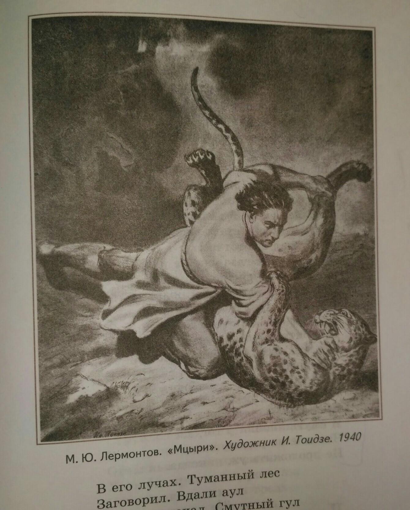 На иллюстрации М. Ю. Лермонтова "Мцыри". Художником которого является И. Тоидзе была написана 1940 году. Иллюстрация описывает бой Мцыри с барсом.