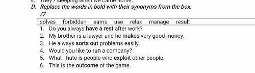 Объяснение: все просто, тут нужно было подобрать синонимы к выделенным словам. Нужно просто знать значения слов. 1. расслабляться, отдыхать 2. зарабатывать 3. решать (проблемы и т. д.) 4. управлять 5. использовать 6. результат