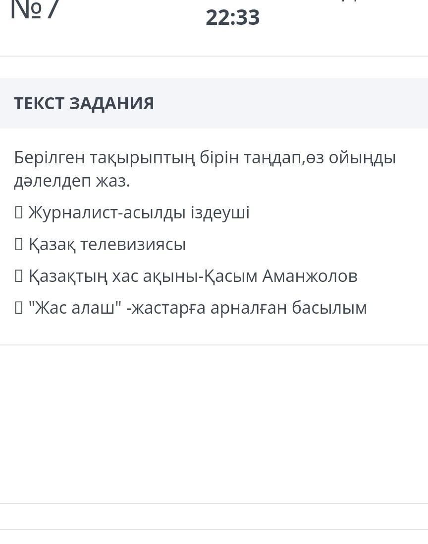 Берілген тақырыптың бірін таңдап , өз ойыңды дәлелдеп жаз . о Журналист - асылды іздеуші ОҚазақ телевизиясы ОҚазақтың хас ақыны - Қасым Аманжолов о " Жас алаш " -жастарға арналған басылым