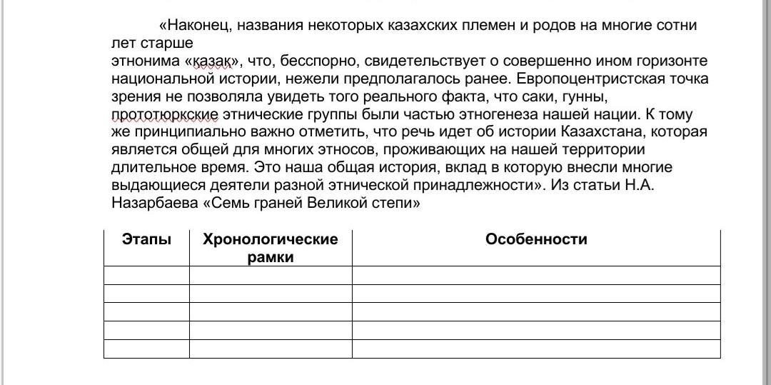 Используя текст и свои знания из курса истории заполните таблицу «Этапы этногенеза на территории Казахстана»