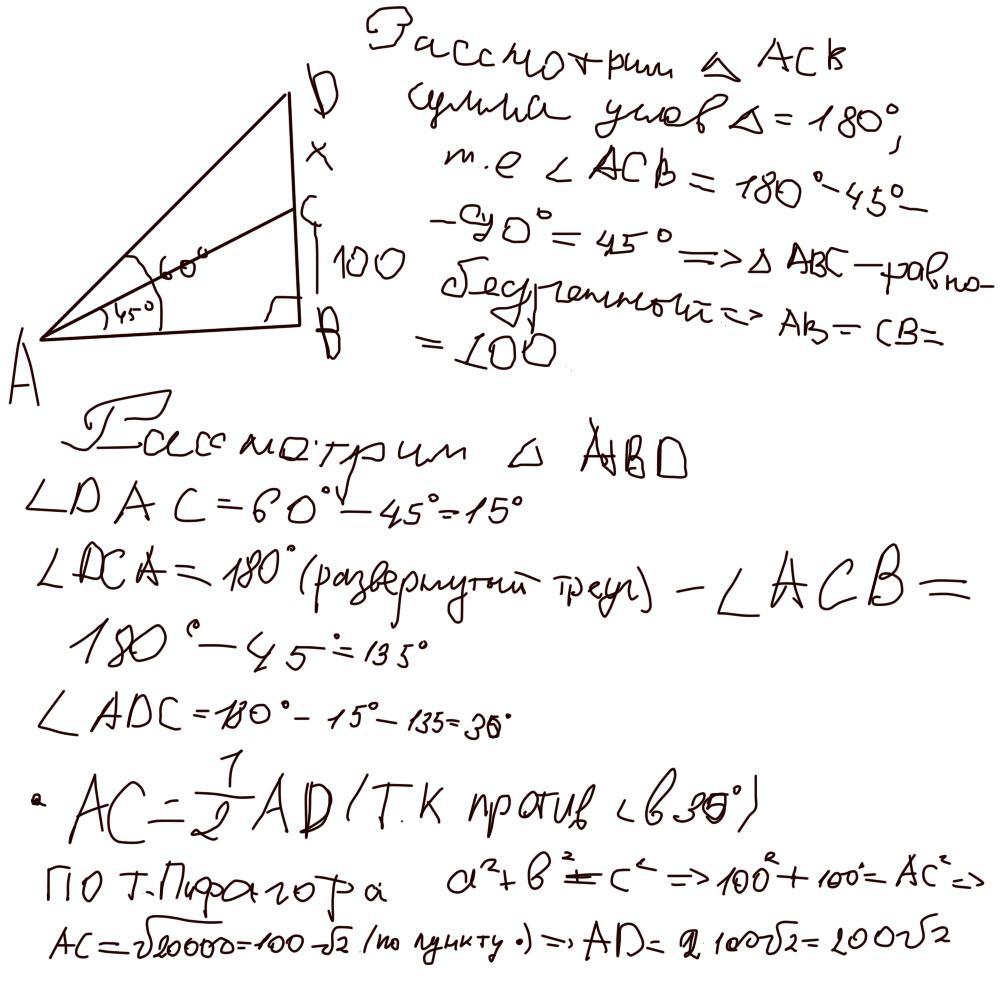 DB^2 = AD^2 - AB^2 => (200sqrt2)^2 - 100^2 = 80000 - 10000 = 70000
