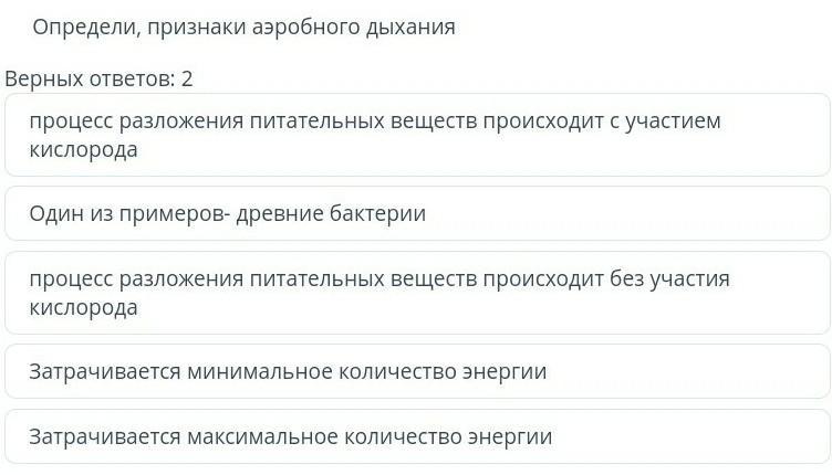 Определи, признаки аэробного дыхания Верных ответов: 2