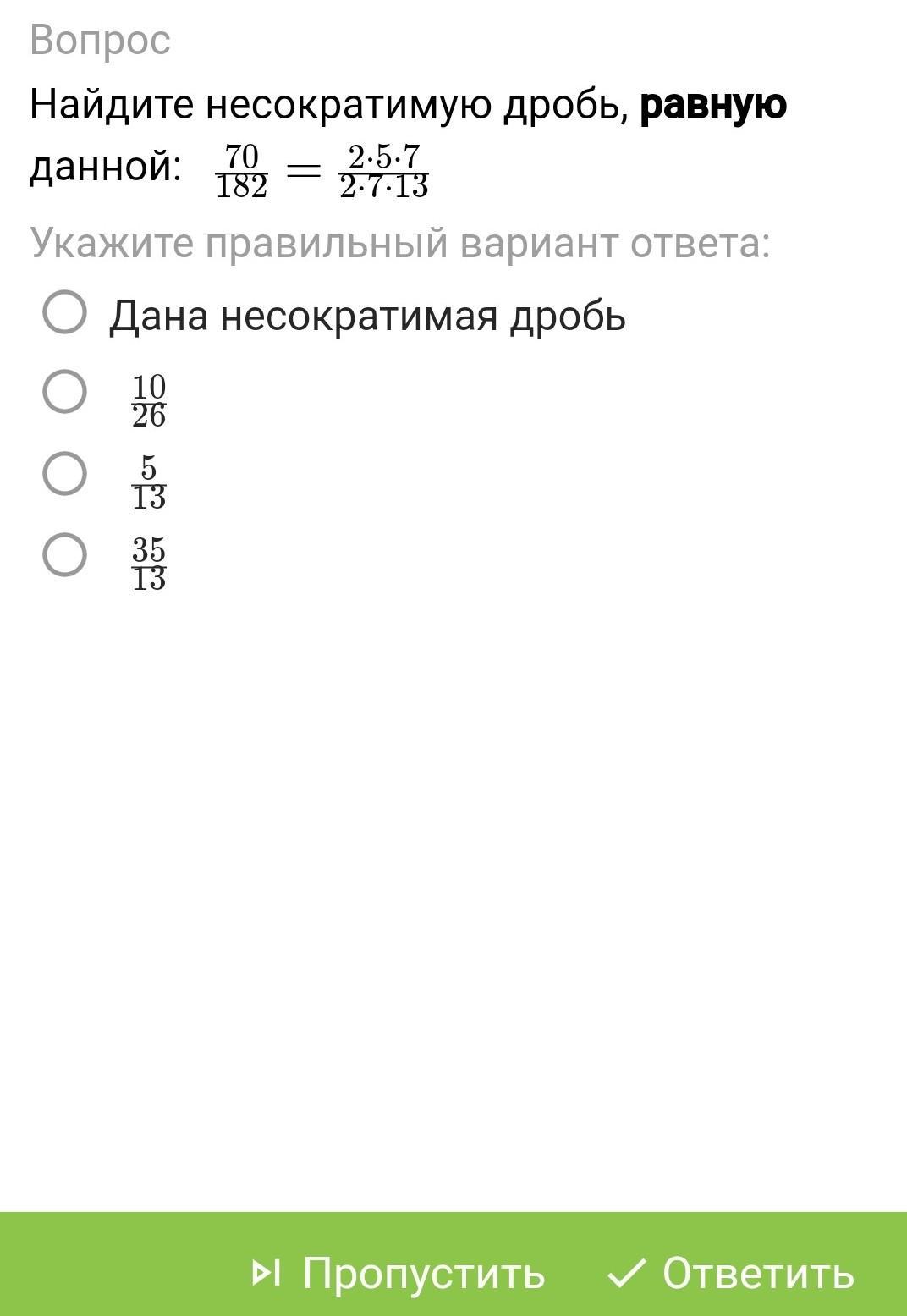 Пошаговое объяснение: сокращаем 2 сверху и 2 снизу, и 7 сверху и снизу. Остается 5/13