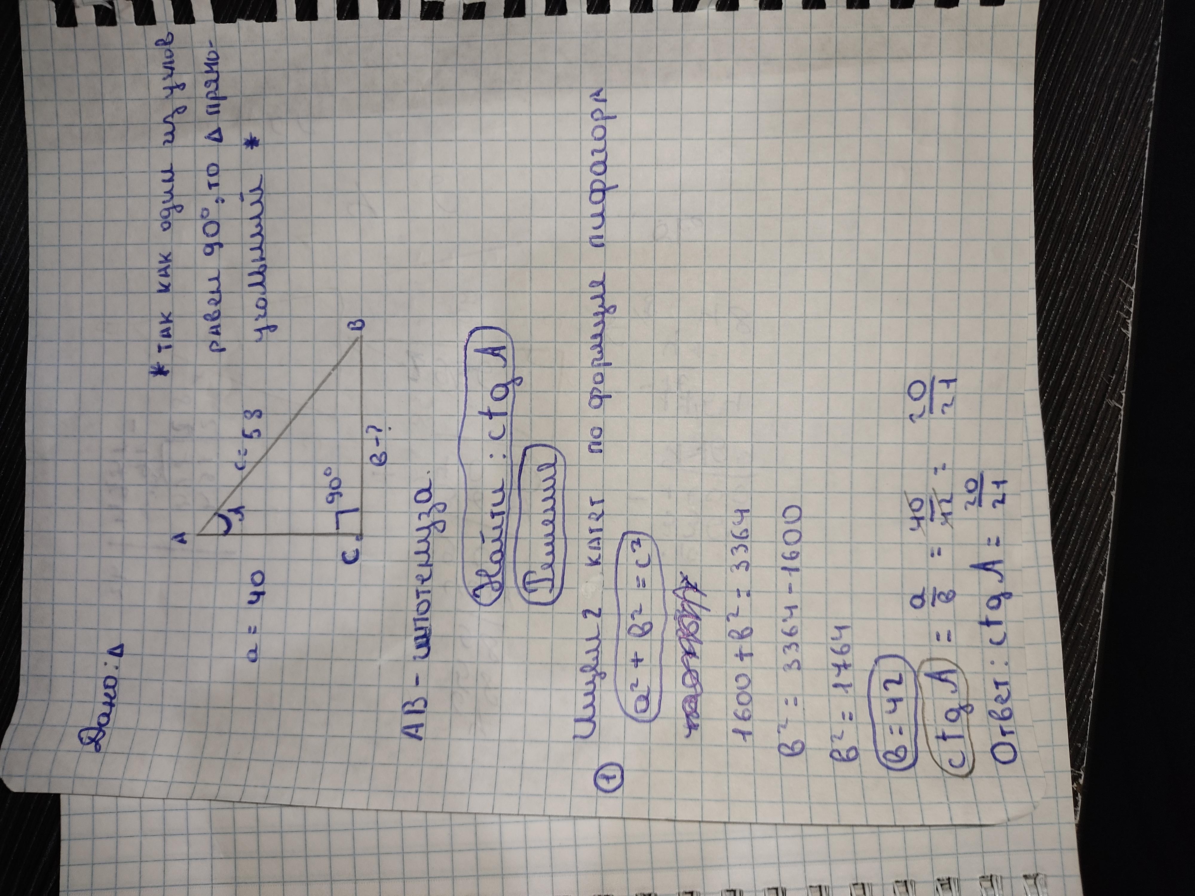 Дан треугольник ABC, в котором ∠C=90°, кроме того, известны его стороны: AC=40 см, AB=58 см. Найди ctgA.