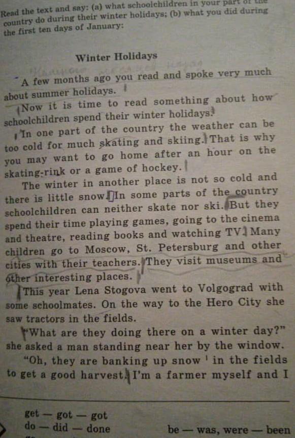 В другом месте зима не такая холодная, и снега там довольно мало. В некоторых частях страны школьники не могут кататься ни на коньках, ни на лыжах. Они играют в игры, ходят в кино и театры, читают книги и смотрят телевизор. Многие дети ездят в Москву, Санкт-Петербург и другие города со своими учителями. Они посещают музеи и другие интересные места.