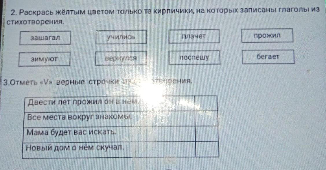 раскрась жёлтым цветом только те кирпичи на которых записано глаголы из стихотворения