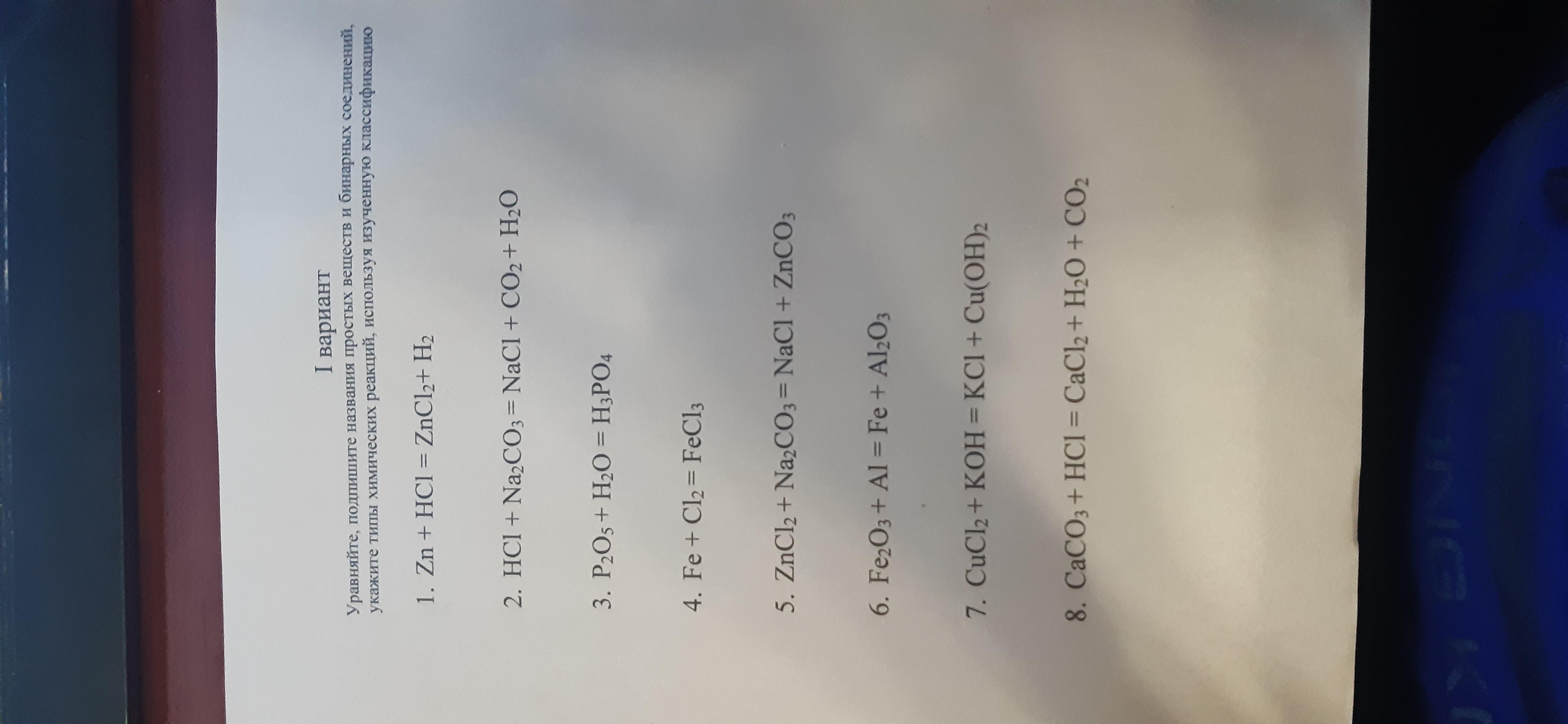 1) Zn+2 HCl = ZnCl2+H2 Тип реакции : Замещение