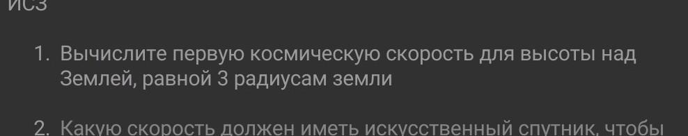 Вычислите первую космическую скорость для высоты над Землей, равной 3 радиусам земли (с полным решением дано, что надо найти и решение по формуле