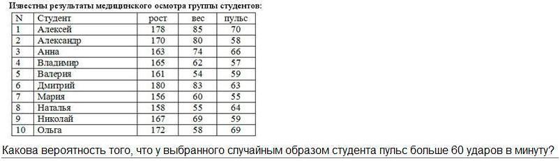 Всего студентов, прошедшие медосмотр, - 10. 5 из них имеют пульс больше 60-ти. Значит вероятность того, что случайно выбранный студент имел пульс больше 60-ти равна: