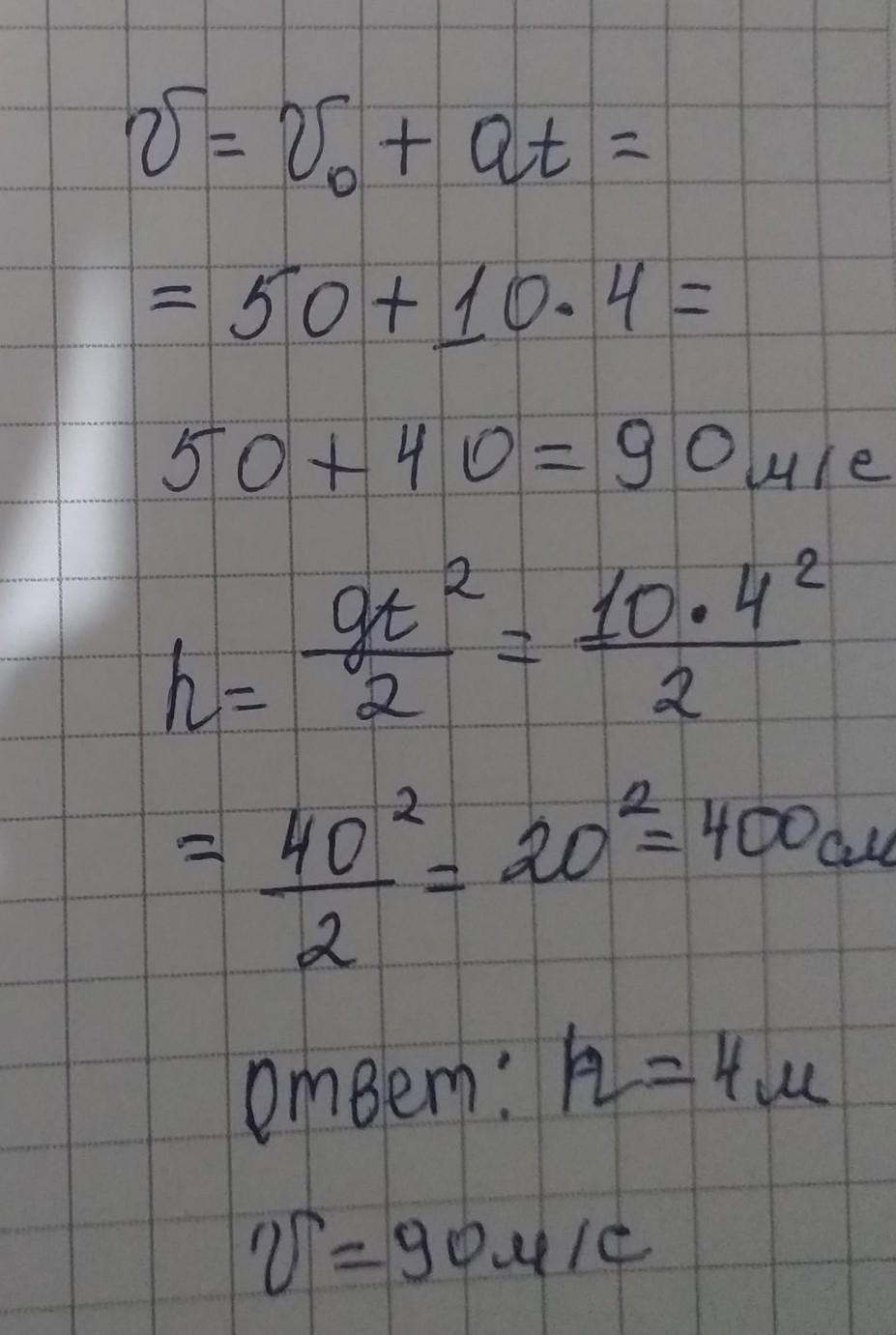 чему равна скорость тела, подброшеного вертикально вверх со скоростью 50м/с, через 4с ? На какую высоту оно при этом поднимается? Принять g=10м/с