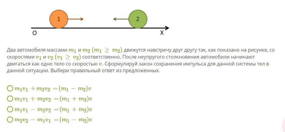 При абсолютно неупругом ударе срабатывает закон сохранения импульса. Сумма импульсов тел до столкновения равна суммарному импульсу тел после столкновения(оба тела движутся как одно целое,массы суммируются) Учитывая,что изначально скорости были противоположны по направлению,правильная формула записана в третьей строчке. Разность импульсов до равна сумме импульсов после столкновения.
