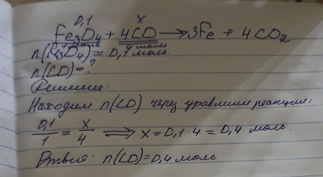 Какое количество угарного газа израсходуется, если на восстановление железа использовали 0,1 моль оксида железа? Fe3O4 + 4CO = 3Fe + 4CO2
