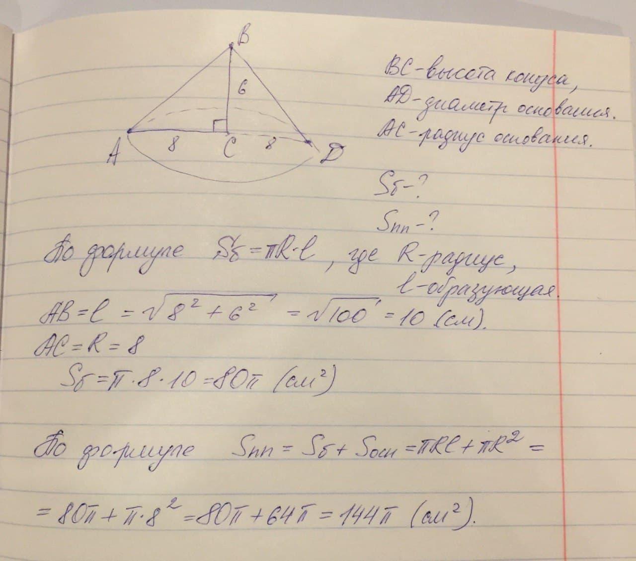 Достаточно срочно! Прямоугольный треугольник с катетами 6 см и 8 см вращается вокруг меньшего катета. Вычислите площади боковой и полной поверхностей образованного при этом вращении конуса.