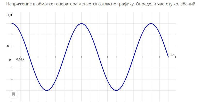 Напряжение в обмотке генератора меняется согласно графику. Определи частоту колебаний.