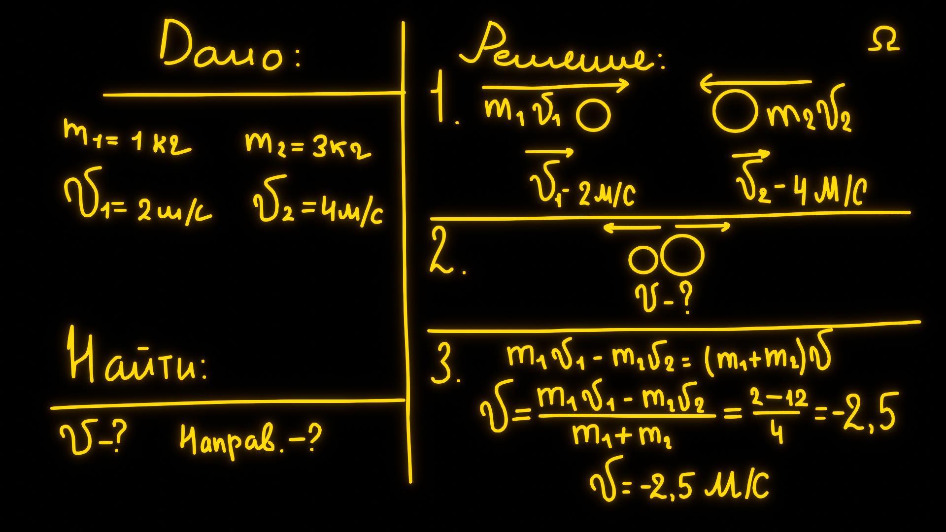 Два шарика, массы которых 1 и 3 кг движутся навстречу друг другу со скоростями 2 и 4