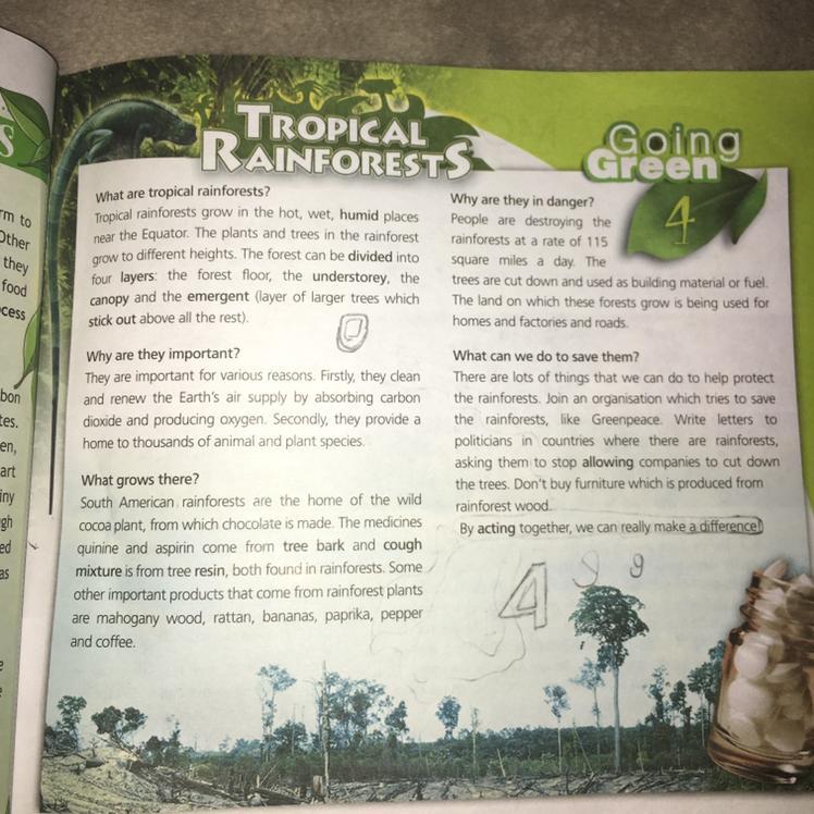 Tropical rainforests grow in the hot, wet, humid places in the Equator. The forest can be divided into four layers the forest floor, the understorey, the canopy and the emergent (layer of larger trees which stick out above all the rest). South American rainforests are the home of the wild Cocoa plant, from which chocolate is made. Some other important products that come from rainforest plants are mahogany wood, rattan, bananas, paprika, pepper and coffee. People are destroying the rainforests at a rate of 115 square milesa day. The trees are cut down and used as building material or The land on which these forests grow is being used for homes and factonies and roads. Join an organization which tries to save the rainforests, like Greenpeace.