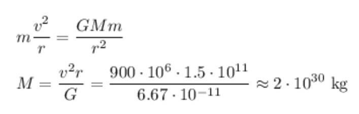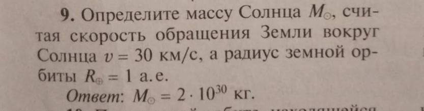 M = v² / (G/R) = v²*R/G = (3*10^4)²*1,5*10^11 / 6,67 * 10^(-11) = 9*10^8*1,5*10^11 / 6,67 * 10^(-11) = 9*1,5*10^19 / 6,67 * 10^(-11) = (13,5/6,67) * 10^19/10^(-11) = 2,023... * 10^30 = 2*10^30 кг