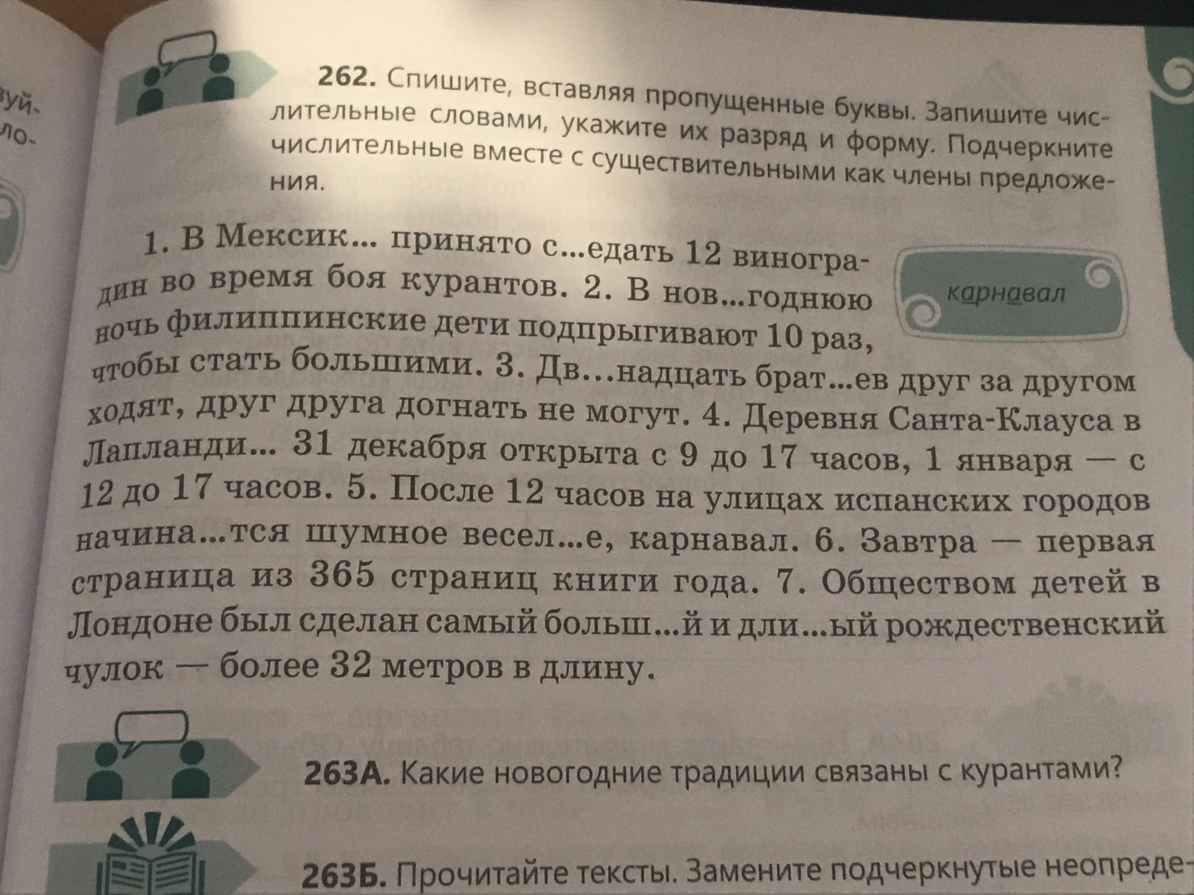Прочитайте в учебнике упражнение 262 на странице 159. Запишите все числительные словами в таблицу в том порядке, в каком они идут в тексте. Повторяющиеся числительные тоже записывайте. Форму слова не меняйте. Если есть предлог, то записывайте числительное с предлогом. Подсказка: в тексте 13 числительных!