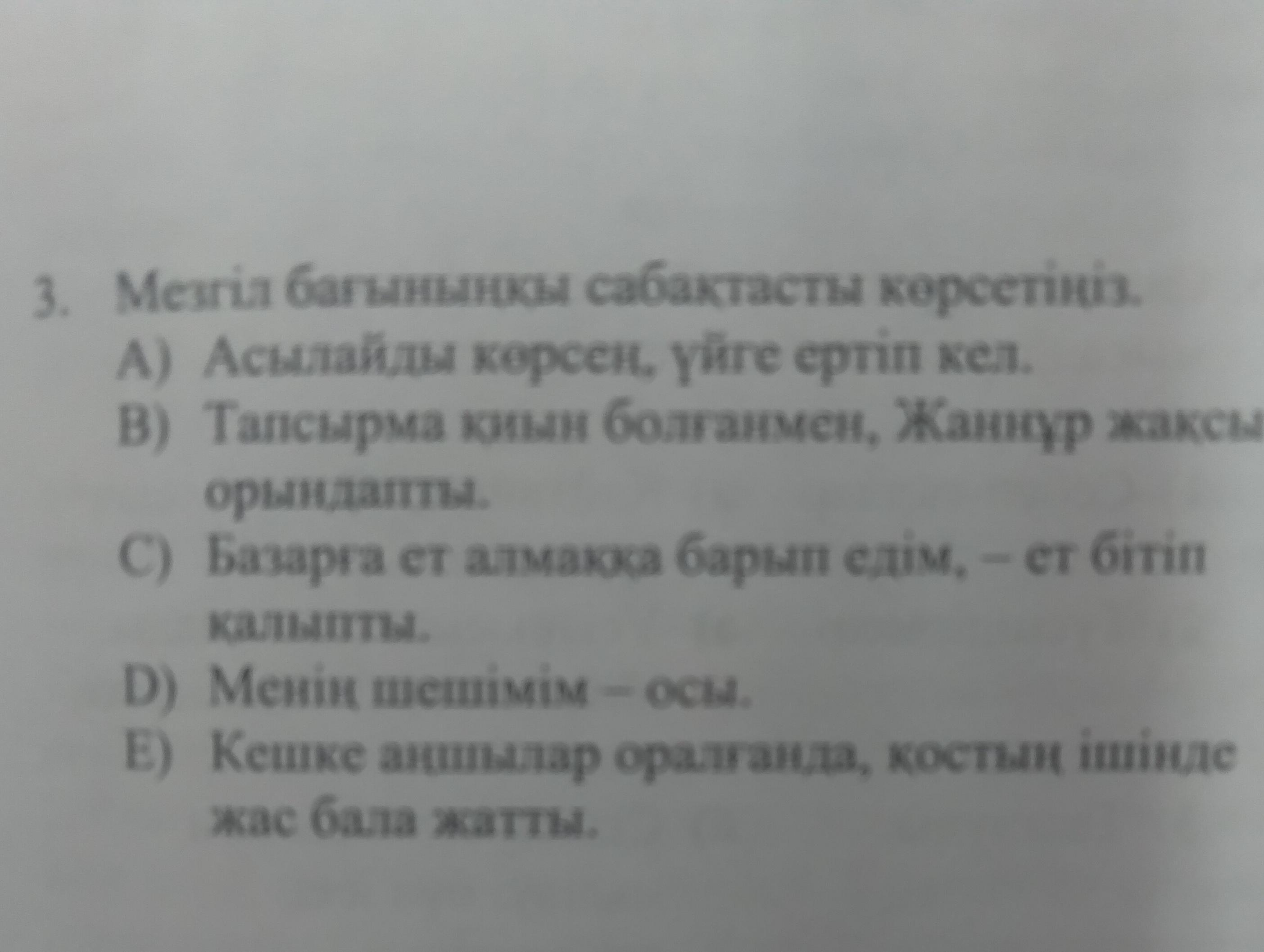 Е) Кешке аңшылар оралғанда , қостың ішінде жас бала жатты