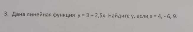 дана линейная функция у=3+2,5х. Найдите у, если х=4,-6,9