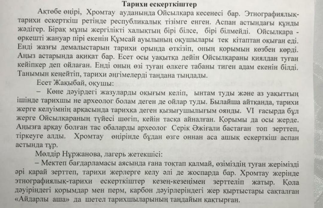 менын мəтінге катысты ойым яғни бурынғы заманнын тарихында улкен сырлар жатыр. Тарихтын озындік ерекшеліктері əр адамнын ойын,қызығушылығын оятады деп ойлаймын