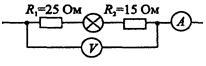 Если сопротивлением вольтметра и амперметра можно пренебречь ( вольтметра- бесконечность, амперметра ноль) то I=U/R отсюда R=U/I=60/1=60 (ом общее сопротивление). При последовательном включении сопротивлений их номиналы складываются. общее сопротивление будет Х+25+15=Х+40 при этом суммарное 60. Очевидно Х=60-40=20 ом.
