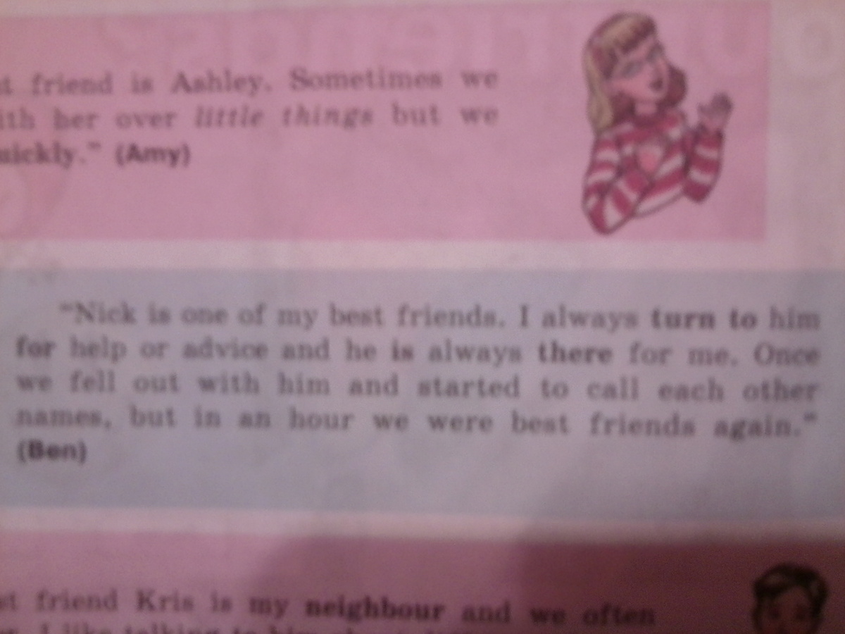 "Ник один из моих лучших друзей. Я всегда обращаюсь к нему за помощью или за советом и он всегда помогает мне. Однажды мы поссорились с ним и начали обзывать друг друга, но через час мы снова были лучшими друзьями" Бен