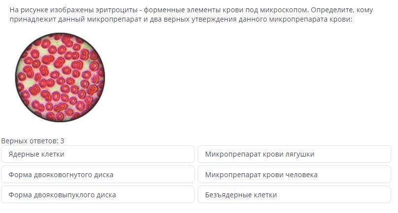 На рисунке изображены эритроциты - форменные элементы крови под микроскопом. Определите, кому принадлежит данный микропрепарат и два верных утверждения данного микропрепарата крови