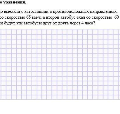 Реши задачу с помощью уравнения Два автобуса одновременно выехали с автостанции в противоположных направлениях первый автобус двигался со скоростью 65 км за час а второй Автобус ехал со скоростью 60 км за час На таком расстоянии будут эти автобусы друг от друга через 4 часа