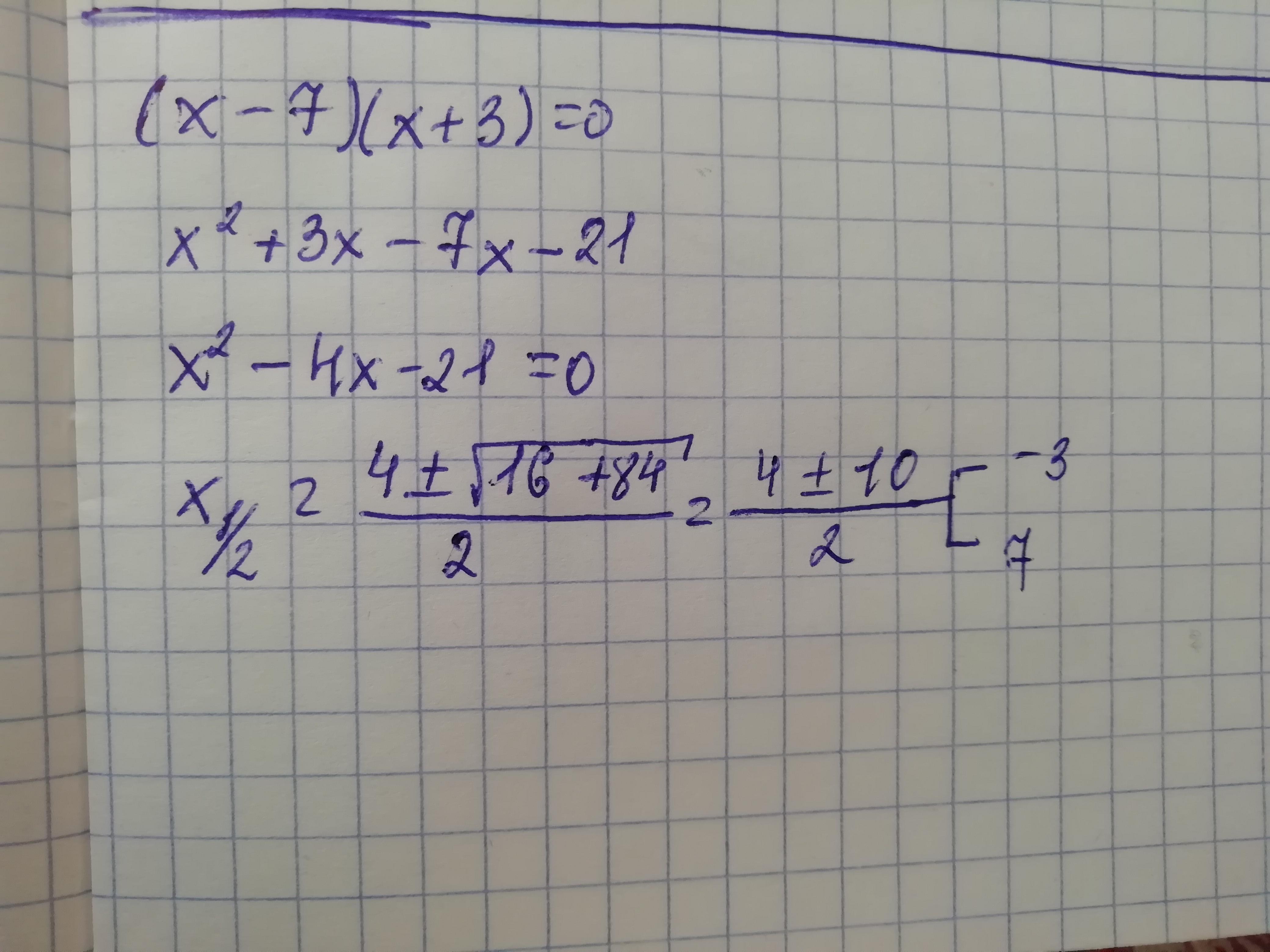 Приведи уравнение (x – 7)(x +3) = 0 к квадратному уравнению вида ax²+ bx + c = 0, и укажите его коэффициенты.РЕШЕНИЕ