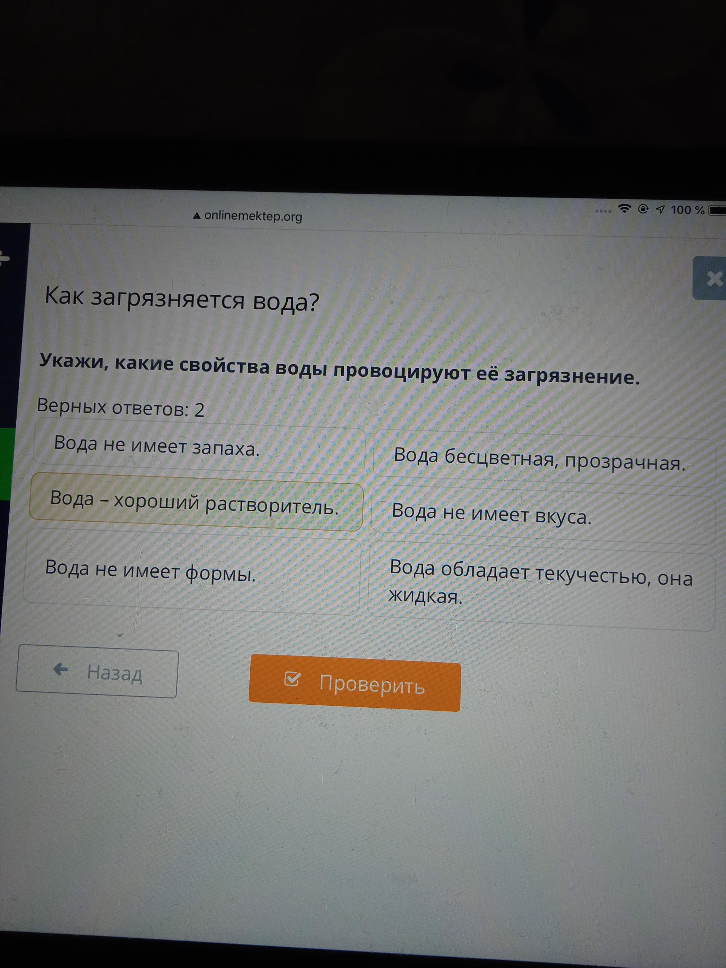 Укажи какие свойства воды провоцируют её загрязнение верных ответов 2 Вода не имеет запаха,Вода-хороший растворитель онлайн мектеп скрин вот