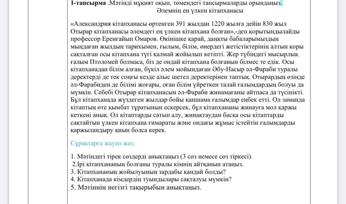 5.Мәтіннің негізгі тақырыбы:Отырарда болып,кейін жойылып кеткен әлемдегі ең ірі кітапқана туралы.Мысырлық ғалым Птоломей болмаса,біз ондай кітапхана болғанын білместе едік.