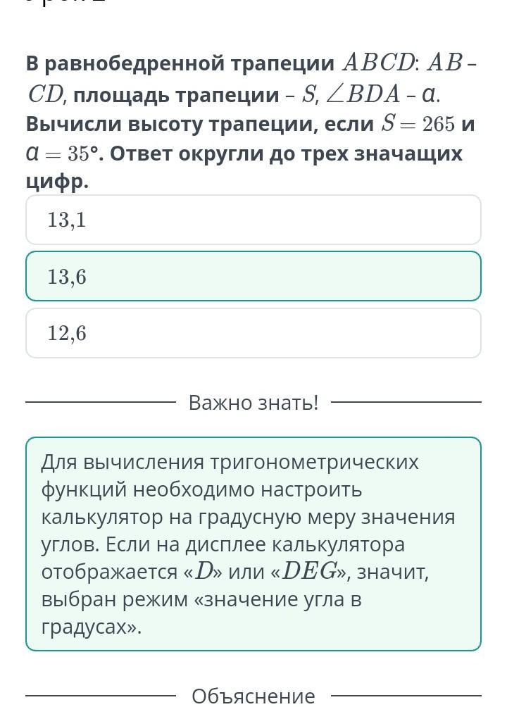 BDA - a. Вычисли высоту трапеции , если S=256 и a=35°. Ответ округли до трех значащих чисел.