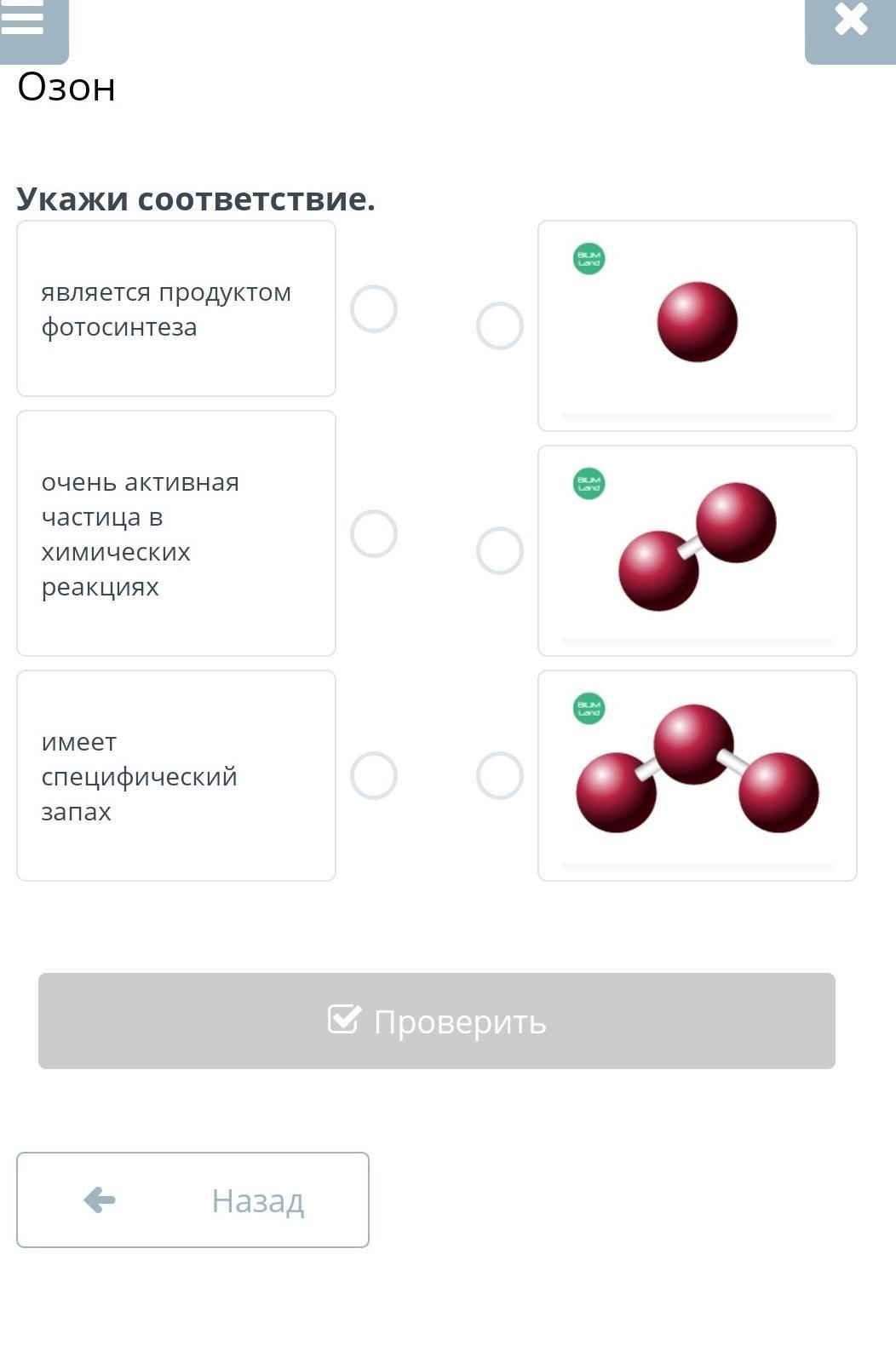 помогите это химия 8 класс в билимленде озон укажи соответствие является продуктом фотосинтеза, очень активная частица в химических реакциях, имеет специфический запах
