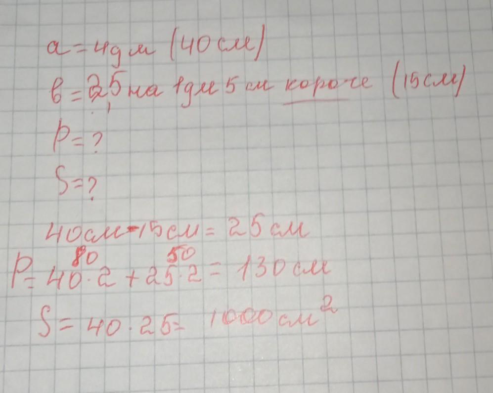 Длина прямоугольника 4 дм а ширина на 1 дм 5 см короче Найди периметр и площадь этого прямоугольника длина сторон выразите в сантиметрах