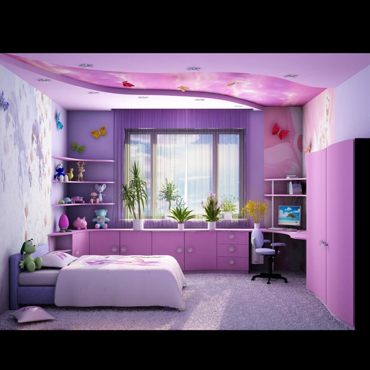 this room has one window, one bed, a table on the right side of the corner, pink bedside tables under the window, a pink cabinet near the table, a shelf in this room is pleasantly pink.