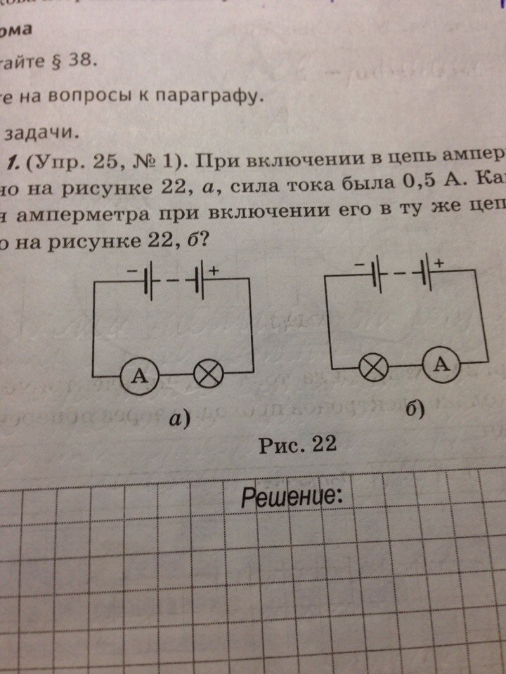 При включении в цепь амперметра так,как показано на рисунке(ниже прикреплен),а,сила тока была 0.5 А.Каковы будут показания амперметра при включении его в ту же цепь так,как изображено на рисунке,б?