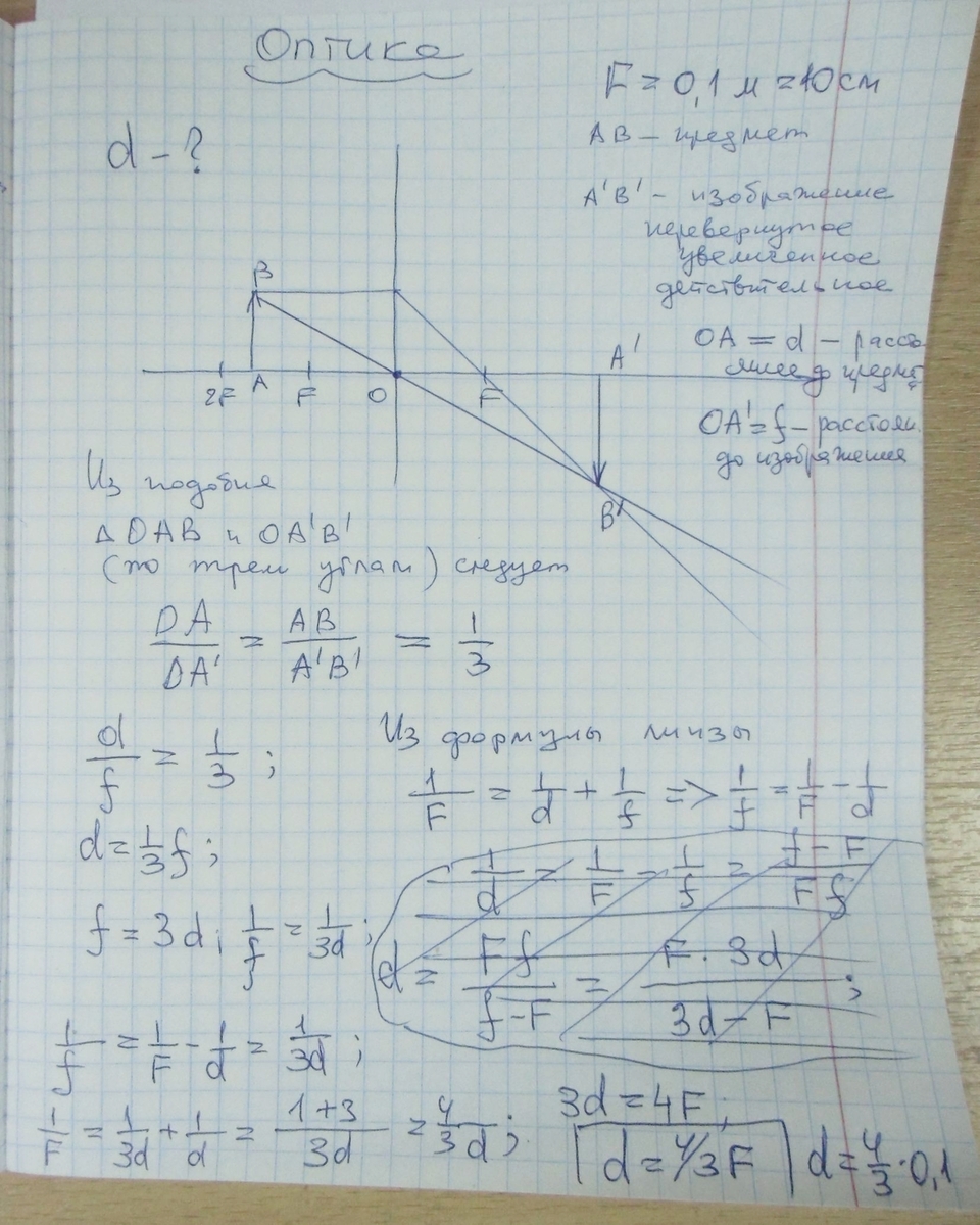 На каком расстоянии от линзы с фокусным расстоянием 10 см надо поставить предмет, чтобы его действительное изображение было втрое больше самого предмета?