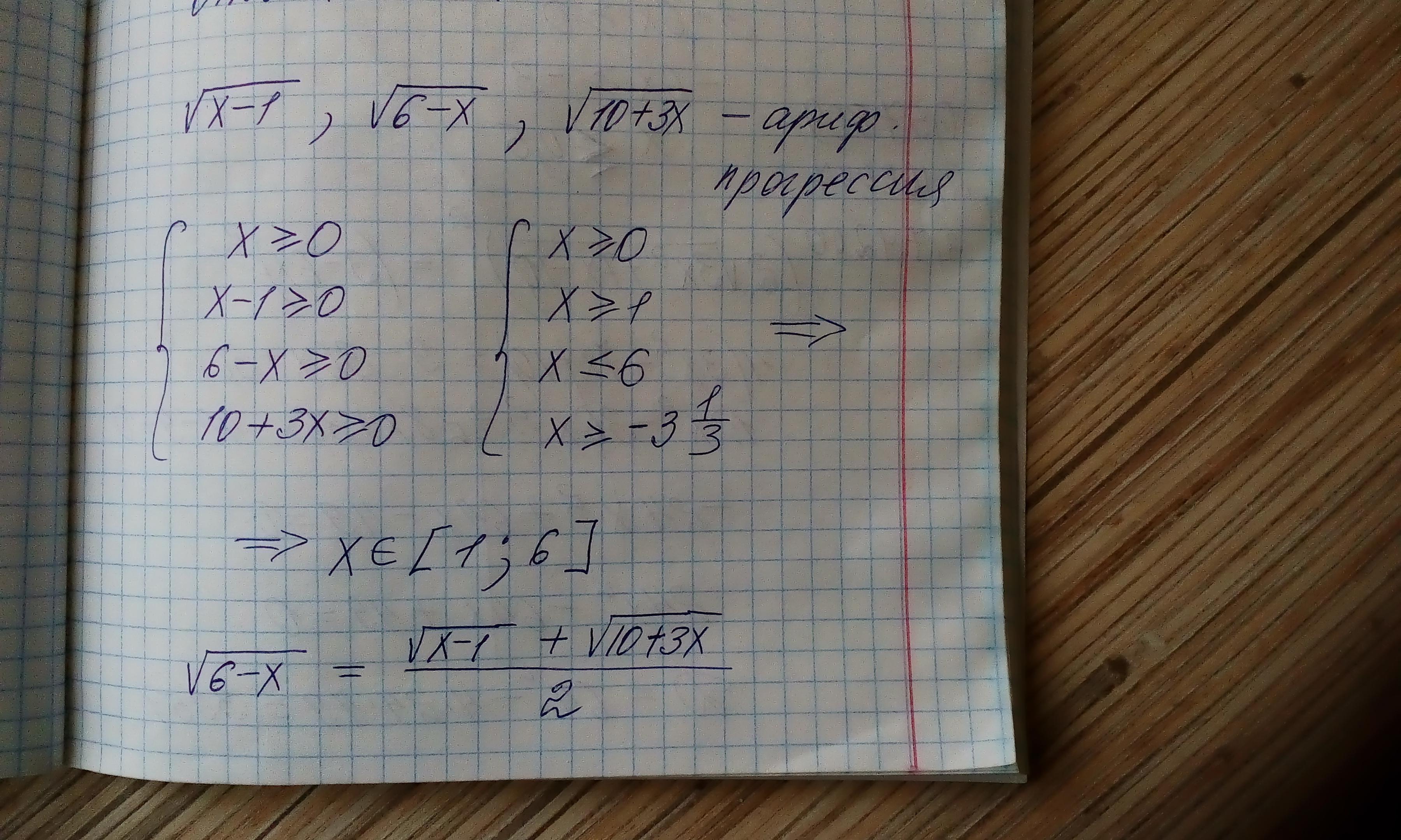 первый,второй и третий члены арифметической прогрессии соответственно равны √х-1, √6-х, √10+3х. (х положительное) найдите значение х