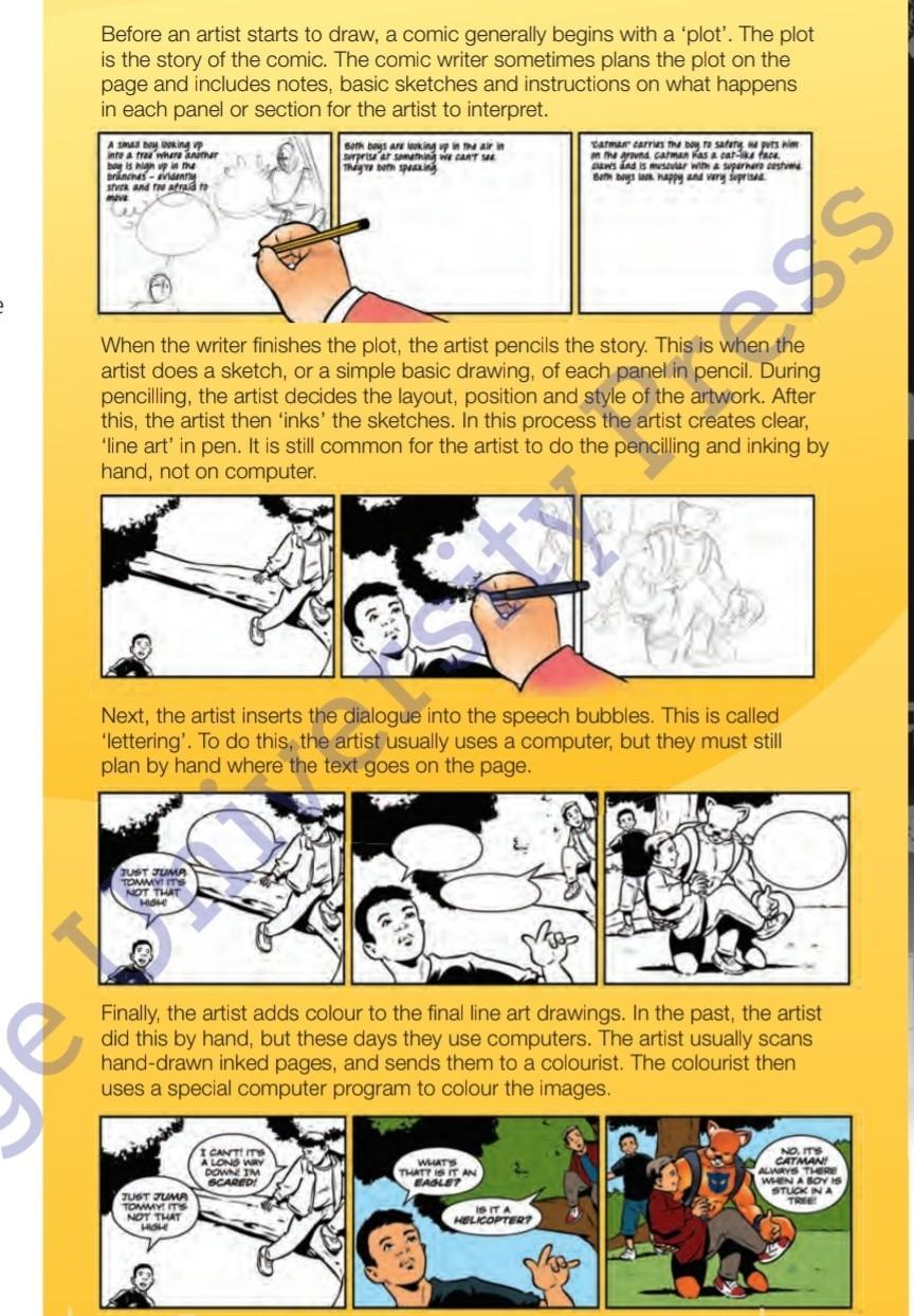 Read the text again. Mark the sentences true or false. Correct the false sentences. 1 A comic usually behind with the artwork. 2 The write sometimes draws parts of the comic. 3 The artist inks the artwork before pencilling it. 4 Computers usually do lettering. 5 The artist decides the position of speech. 6 The colourist colours the comic by hand.
