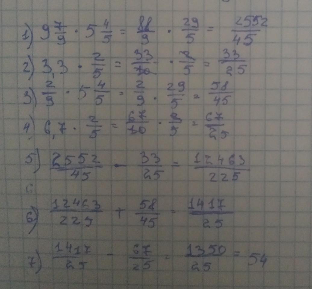 Помогите решить . Найти значение выражения: 9 7/9* 5 4/5-3,3*2/5+2/9*5 4/5-6,7*2/5 . Пожаааааааааааааалуста.