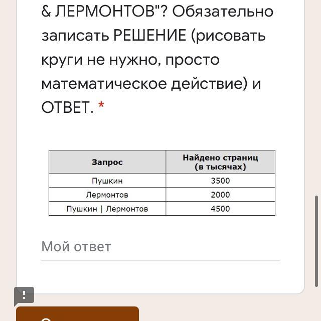 В таблице приведены запросы и количество найденных по ним страниц (в тысячах) некоторого сегмента сети Интернет. Какое количество страниц (в тысячах) будет найдено по запросу: "ПУШКИН & ЛЕРМОНТОВ"? Обязательно записать РЕШЕНИЕ (рисовать круги не нужно, просто математическое действие) и ОТВЕТ. *