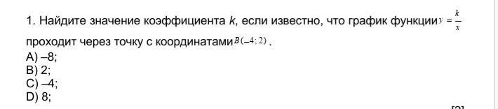 Найдите значение коэффициента k, если известно, что график функции проходит через точку с координатами В(-4;2)